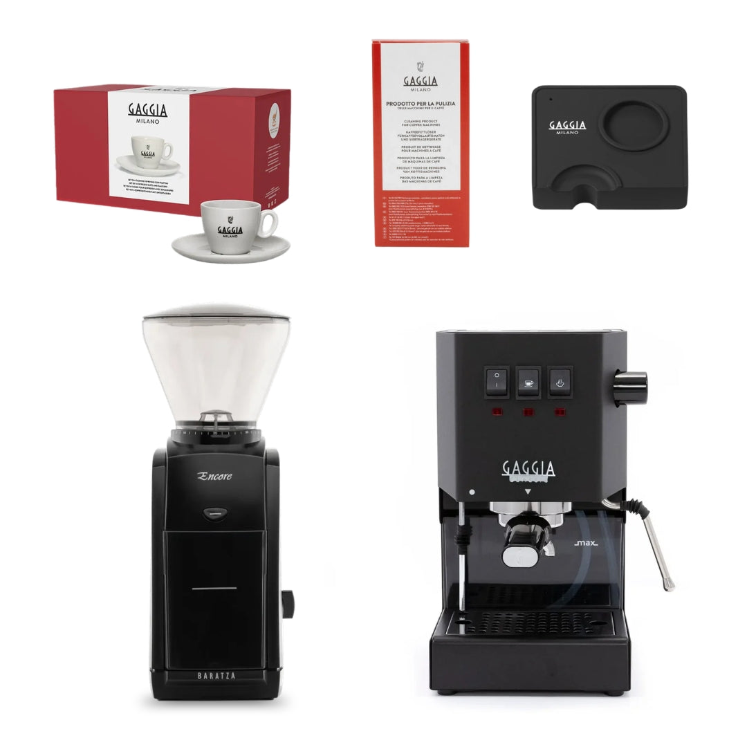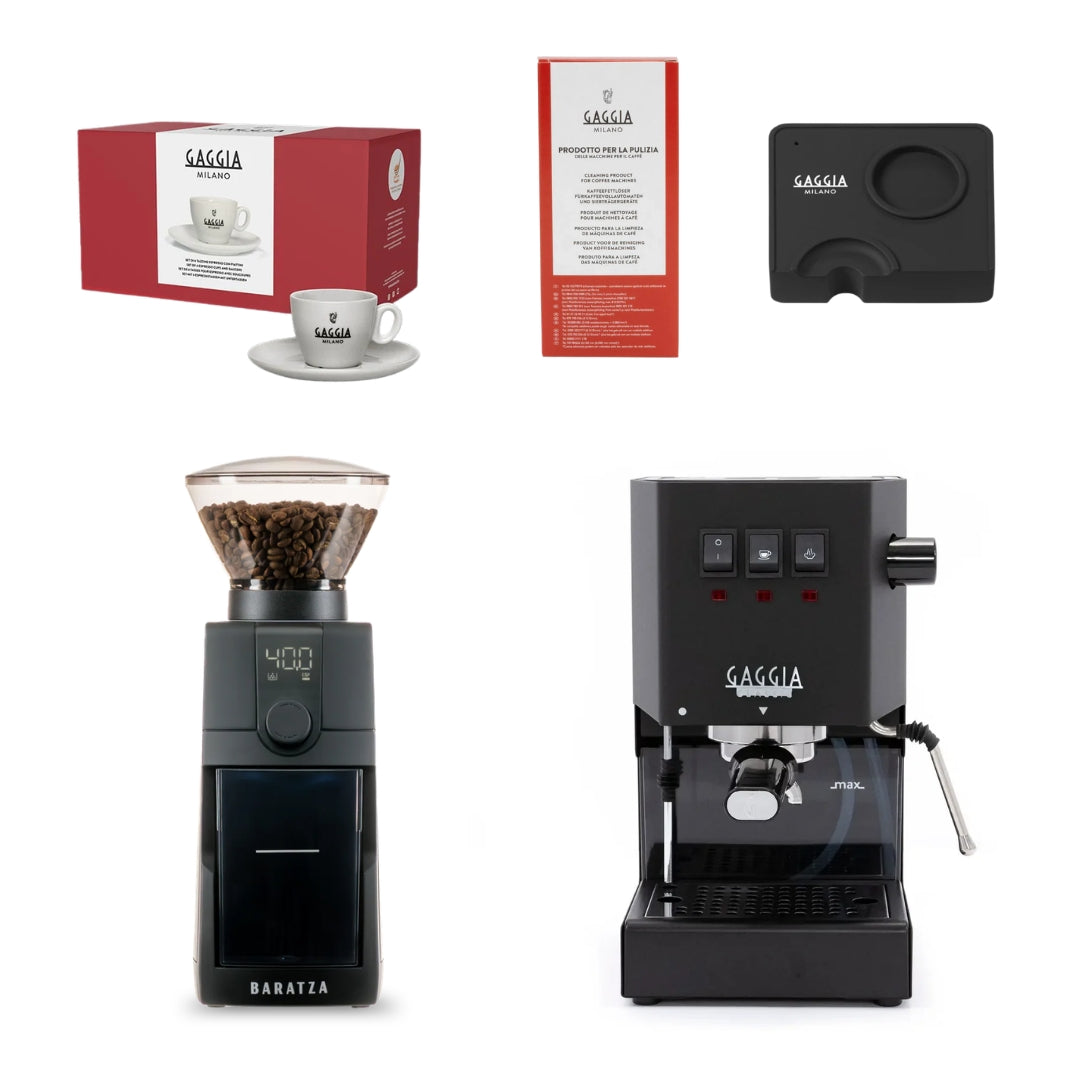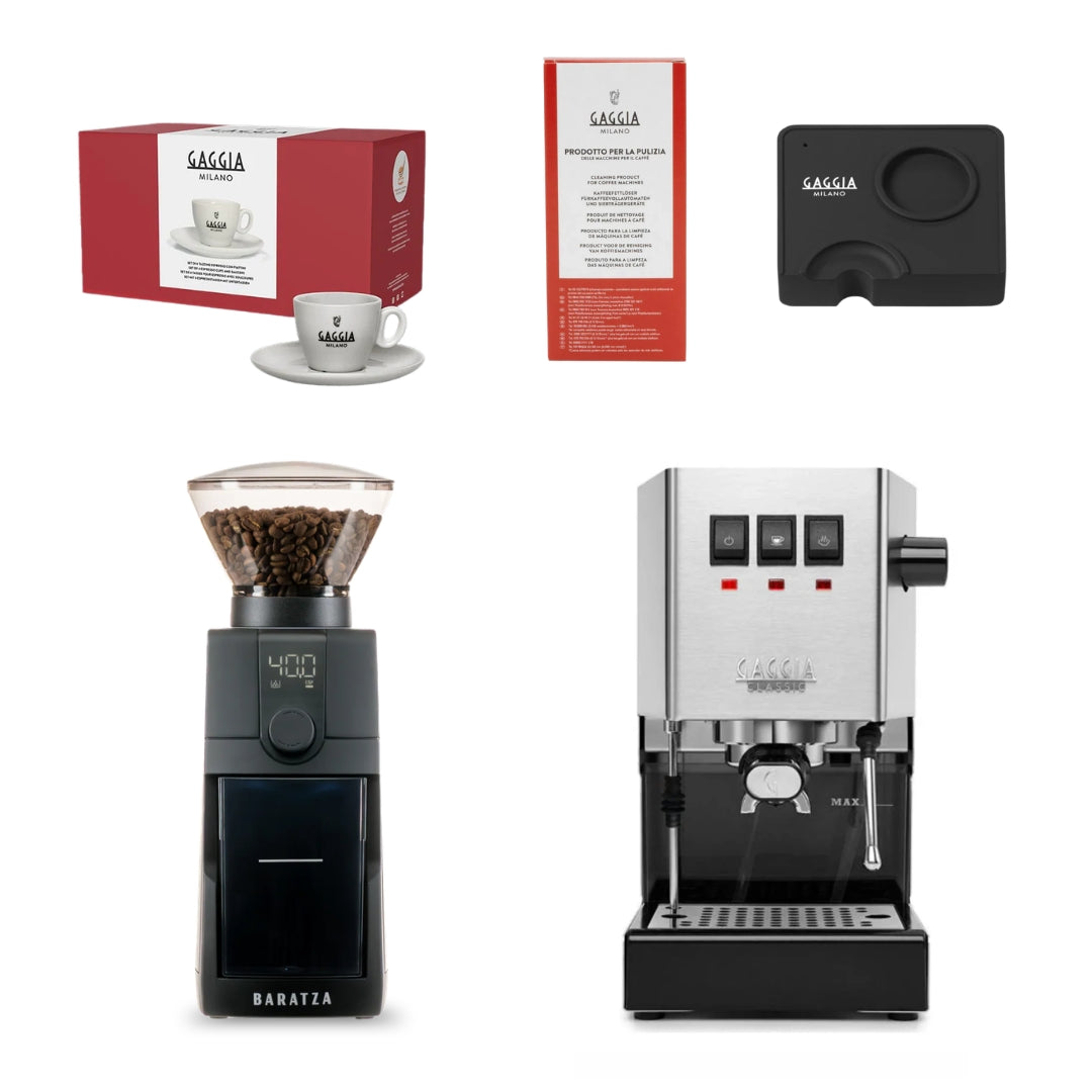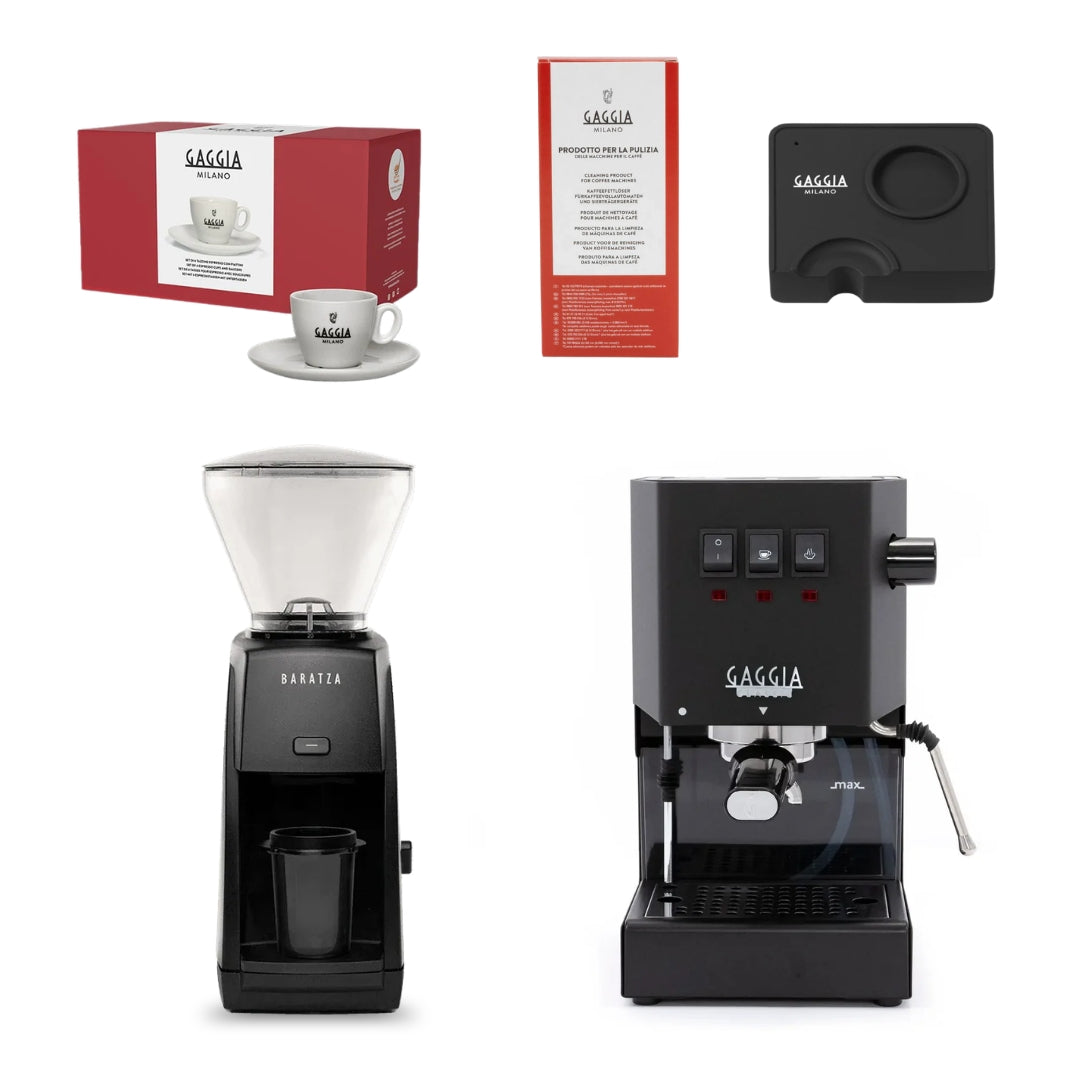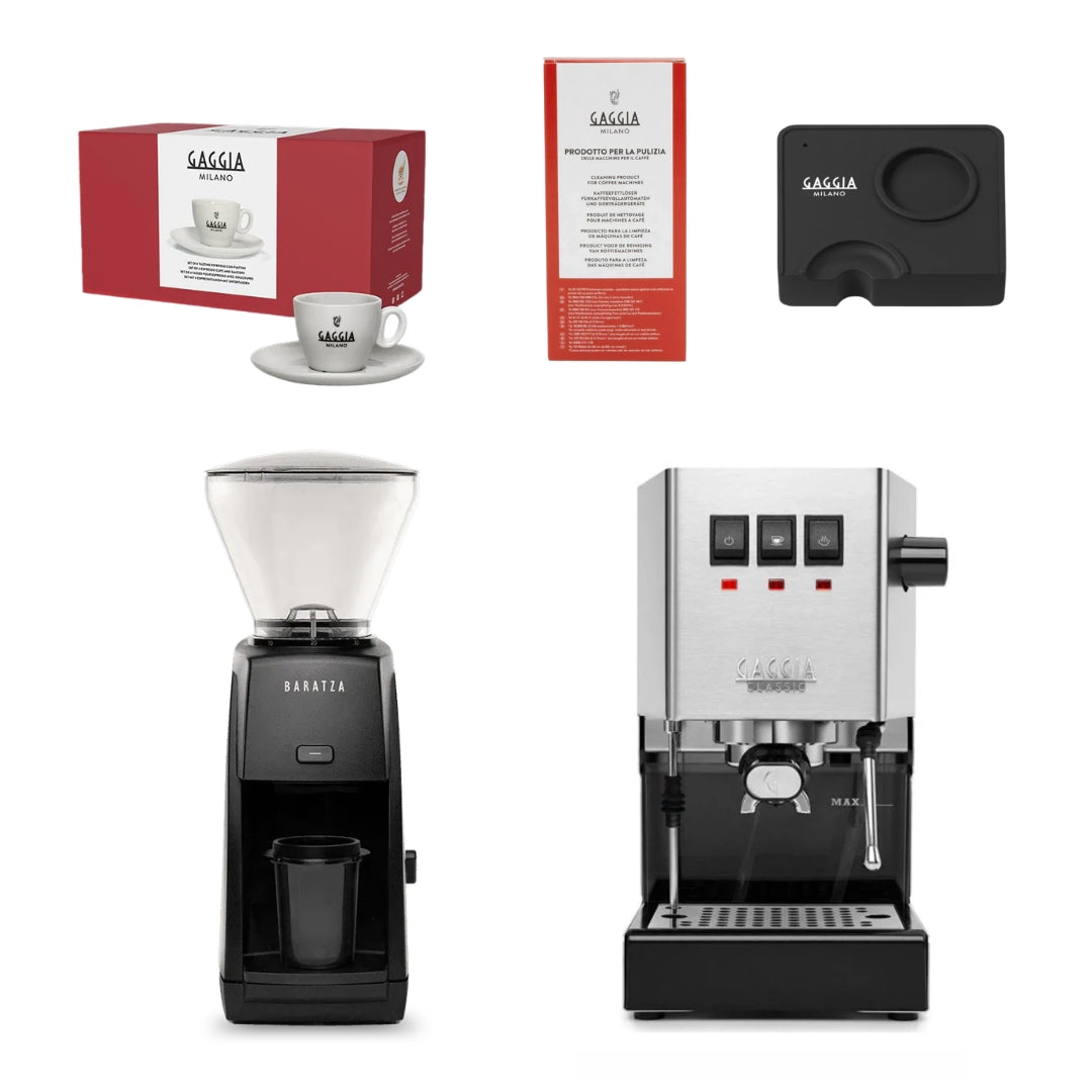 This bundle includes the powerful Gaggia E24 espresso machine, essential barista accessories, and your choice of Baratza grinder — so you have everything needed to grind, brew, and enjoy perfect espresso from day one.
